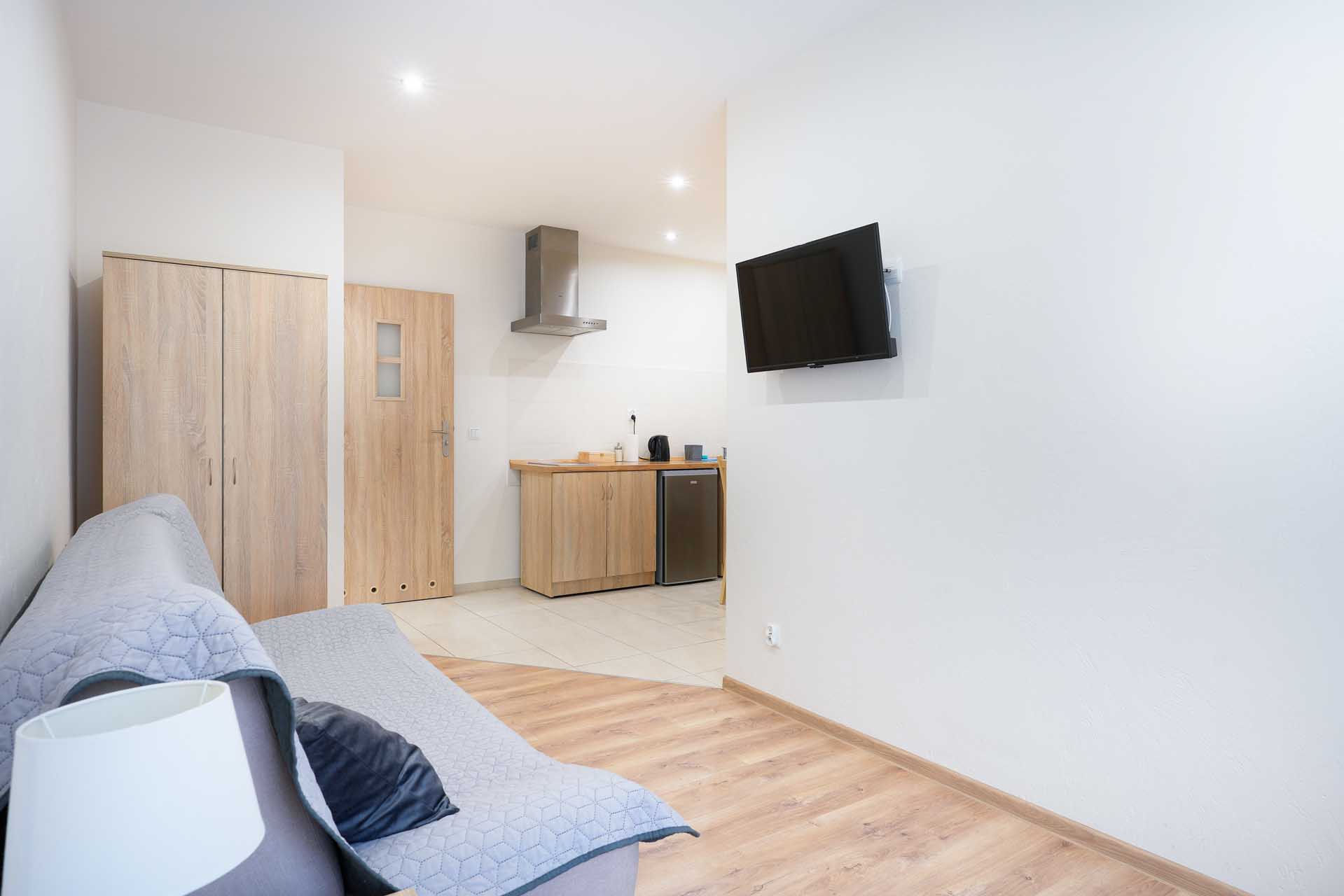 darmowe wifi dostepne na terenie całego obiektu, wieszaki na ubrania, szafa, telewizor, akcesoria kuchenne, płyta indukcyjna, czajnik elektryczny, lodówka, kosmetyki łazienkowe, ręczniki, suszarka do włosów, możliwość wstawienia łóżeczka dla dziecka
