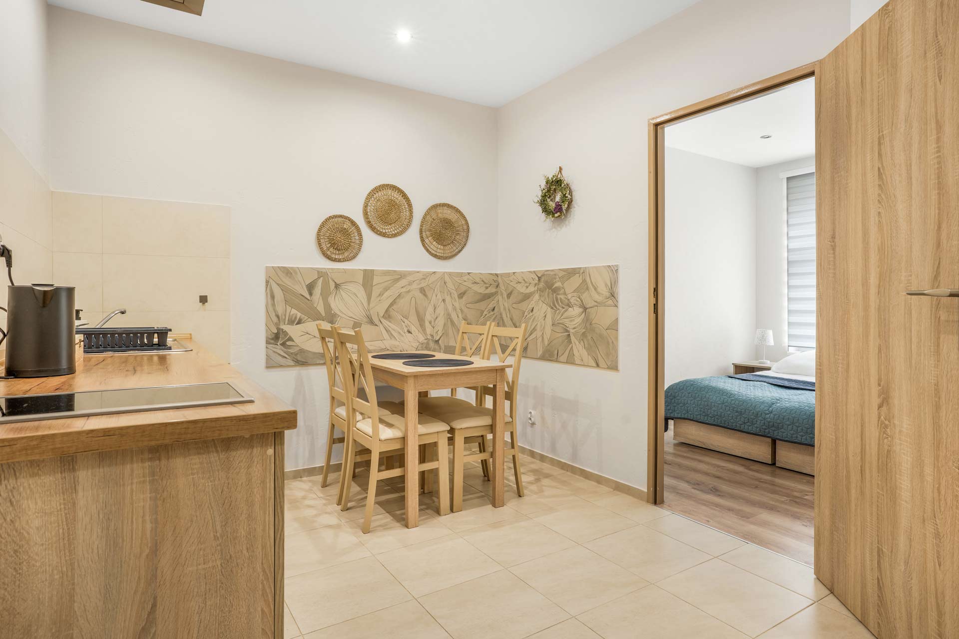 Kuchnie wyposażone są w płytę indukcyjną, lodówkę, czajnik elektryczny itd. Na deszczowe dni – telewizja kablowa i Wi-fi. W łazienkach są kabiny prysznicowe.