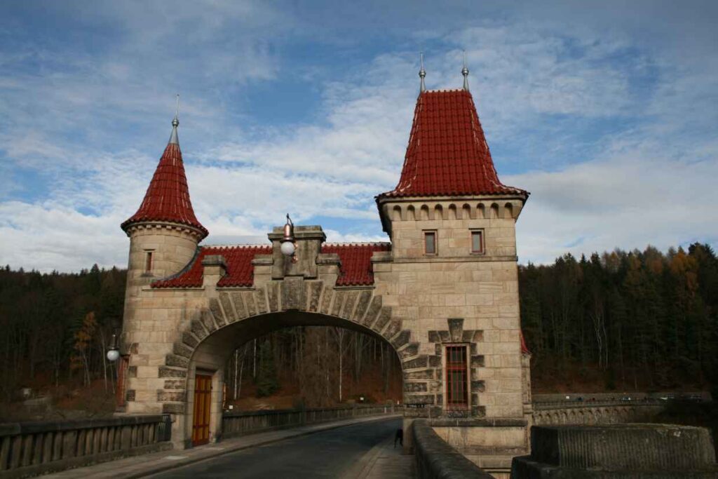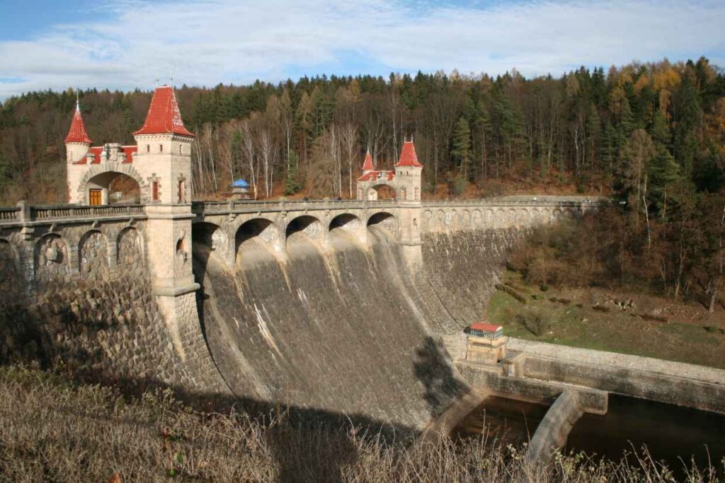 Niedaleko Zoo, 6 km dalej w miejscowości Tešnov, jest piękna kamienna zapora wodna, przecinająca rzekę Łabę. Zapora Les Království, co tłumaczy się na „Las Królestwa”, znana również pod nazwą „Bílá Třemešná” albo „Těšnovská”, jest jedną z najstarszych zapór w Czechach. Konstrukcja powstała w latach 1910-1919. Głębokość zbiornika przy zaporze to ok. 28 m. Zbiornik ma długość 5,1 km, a jego powierzchnia przy maksymalnym napełnieniu wynosi 85 hektarów. Od 1923r przy zaporze działa elektrownia wodna. Koroną zapory prowadzi droga lokalna lecz jest to też niepowtarzalne miejsce spacerów. Zapora jest piękna i malowniczo wkomponowana w krajobraz, pod względem architektury należy do najpiękniejszych obiektów hydrotechnicznych w Czechach. Sama zapora, wieże i dom pracownika obsługi technicznej sprawiają bajkowe wrażenie dodatkowo wzmocnione zaporowym jeziorem i okolicznymi lasami.
